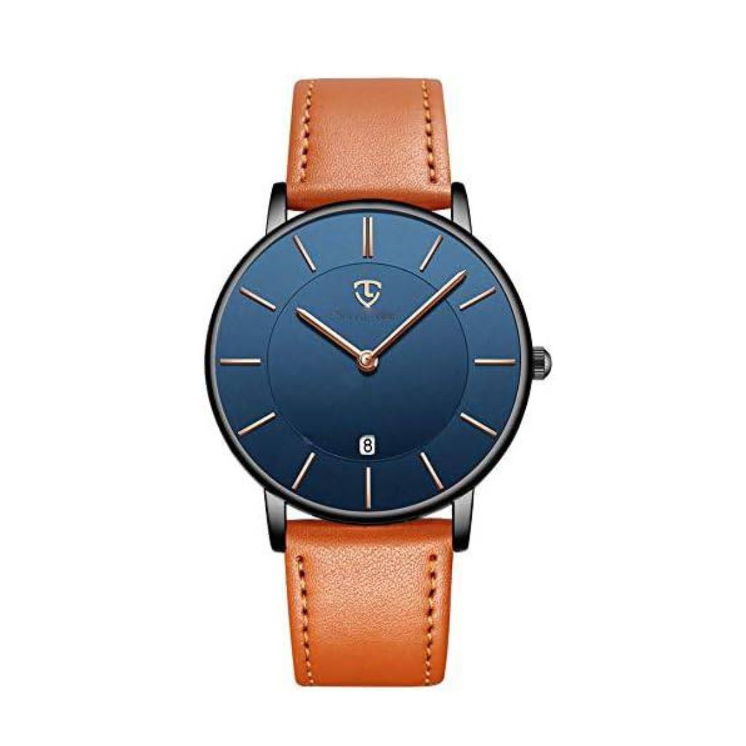 Extremely Thin Minimalist Men’s Leather Watch with Date Display Gift